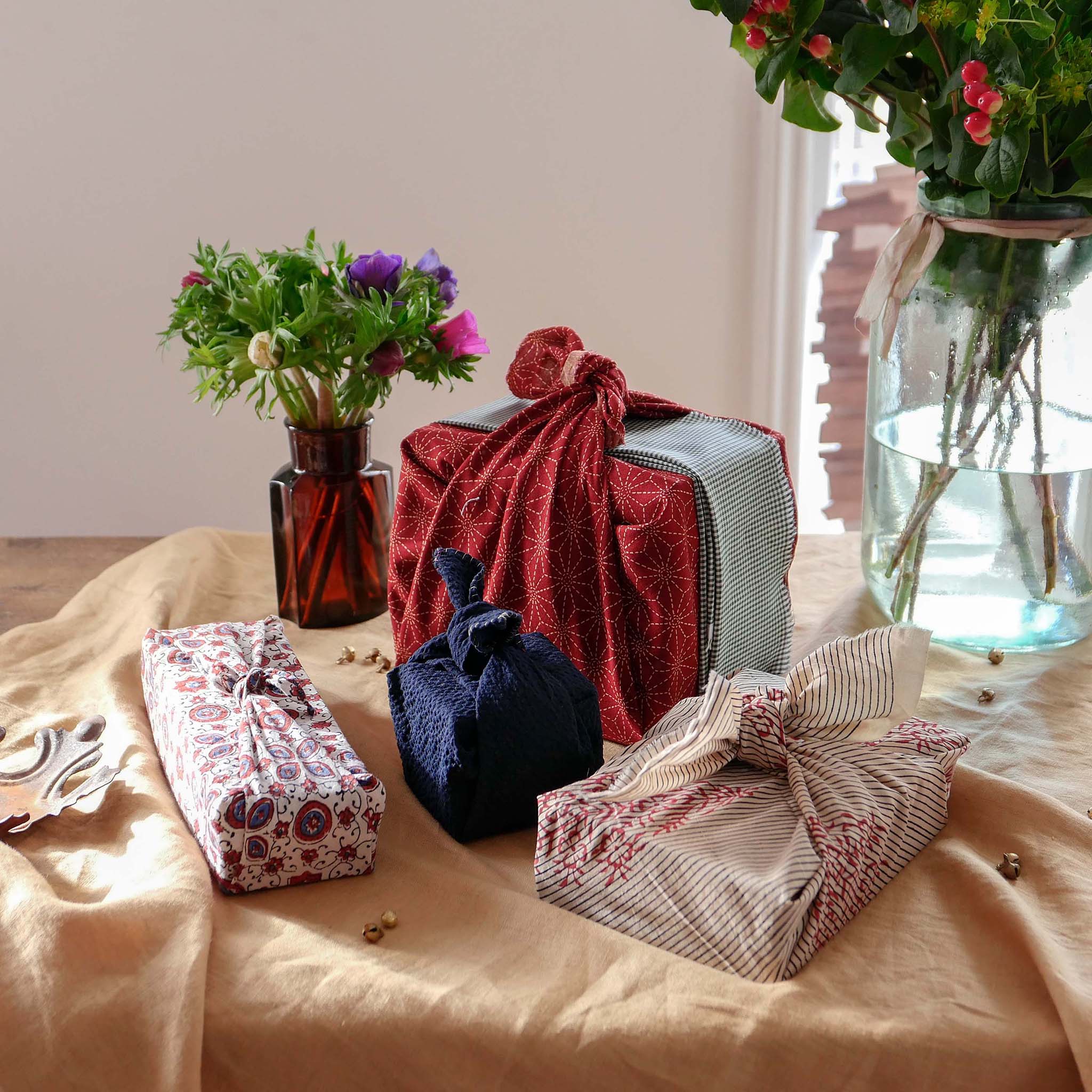 All you need to tie Furoshiki is a square piece of cloth. The size of the cloth depends on the size of the parcel, but 50 x 50cm is a popular and versatile size. Light and Medium weight cottons such as our block prints, ikats, Japanese printed poplins and hand-loomed stripes are perfect.