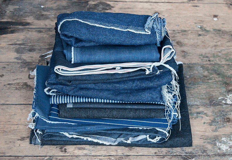 There are many different types of denim. Washed Denim is the most common type; it is washed after dyeing to soften and shrink the fabric, and is artificially faded to make garments look like they’ve been worn. Raw Denim is not washed after dyeing and only softens and fades once worn. Selvedge Denims are woven on small shuttle looms, so the fabric is narrow and has a finished edge called a ‘selvedge’ that is incorporated into the production of some jeans and is considered a sign of quality. Handwoven denims from India also have a finished selvedge edge as they are woven on narrow handlooms. They are softer than most denims and feature occasional slubs.