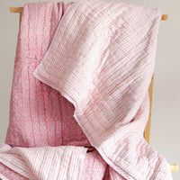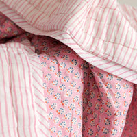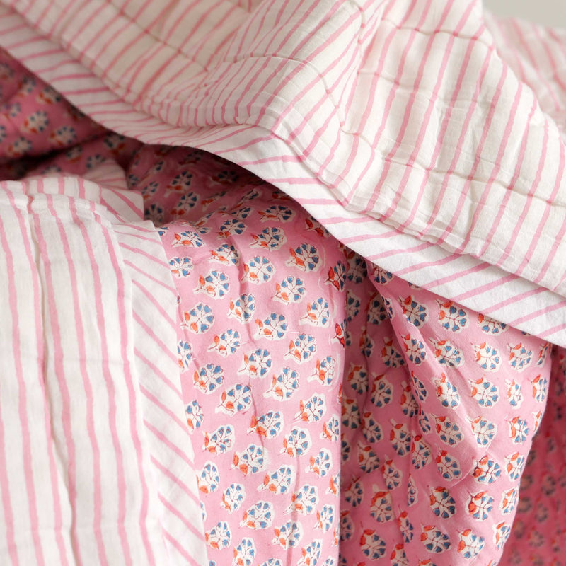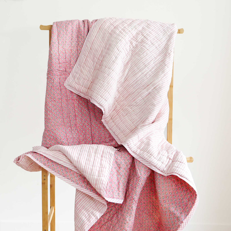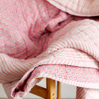 These quilts were commissioned by us. Two coordinating prints, a pink floral and a pink and white stripe are used together and the quilt is hand stitched with a beautiful pattern.