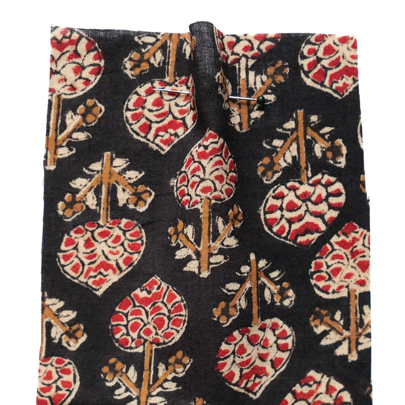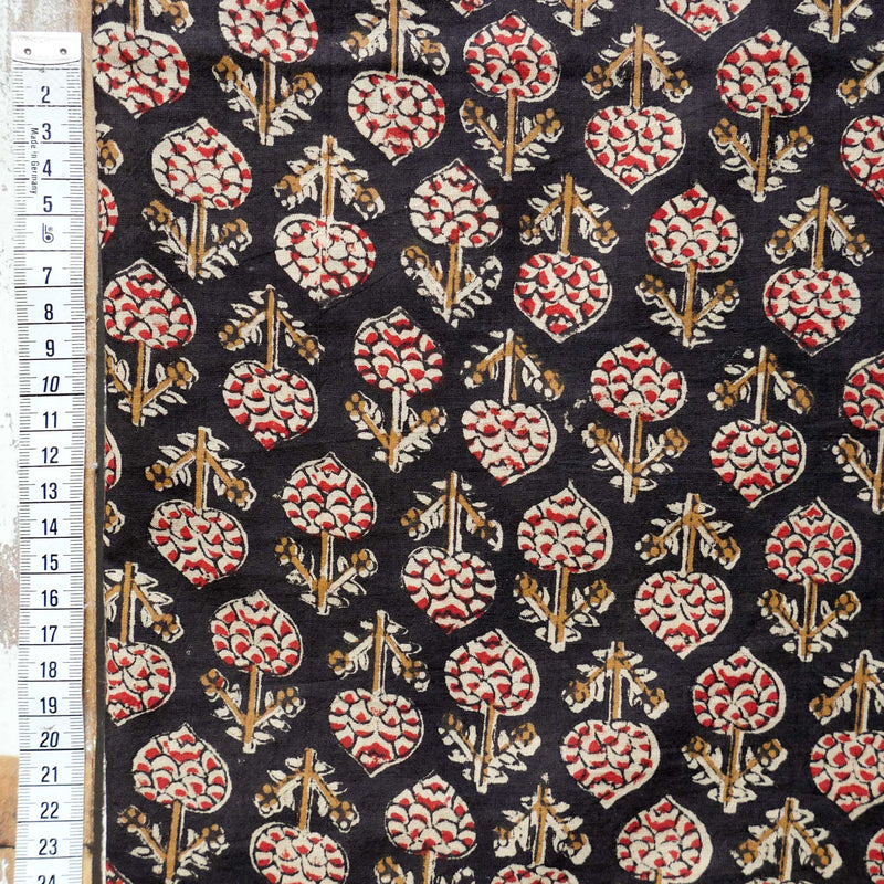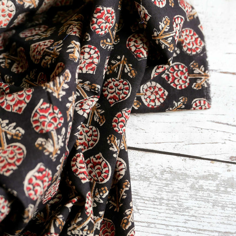 £17.40/mThis is a hand-loomed cotton, hand-printed with a small pomegranate repeat in iron black, yellow, and red. We love the soft hand-loomed cotton and the imperfections that come from hand printing. This lightweight cotton is suitable for shirts and dresses.