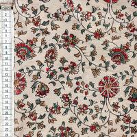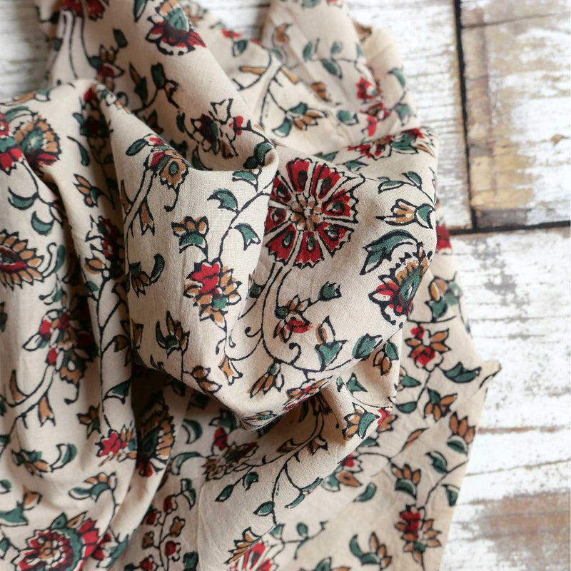 £17.40/mThis is a parchment coloured, hand-loomed cotton, printed with an all over floral vine print. We love the character and the imperfections that come from hand printing. This lightweight cotton is suitable for shirts and dresses.