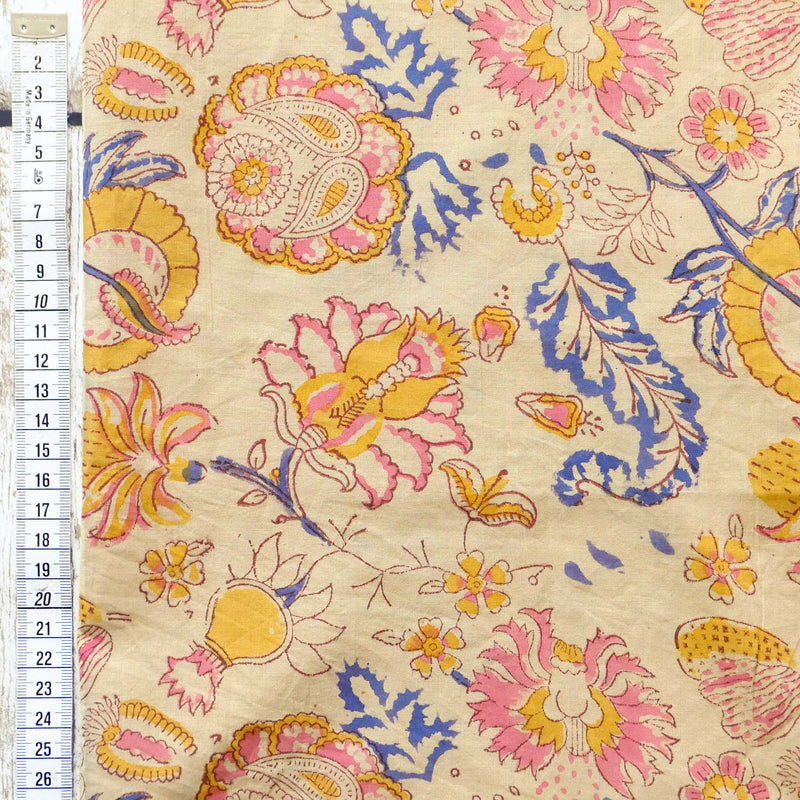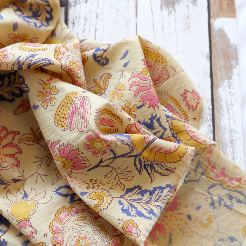 £17.40/mThis is a hand-loomed cotton, hand-printed with a pretty floral design in yellow, pink and blue. We love the soft hand-loomed cotton and the imperfections that come from hand printing. This lightweight cotton is suitable for shirts and dresses.