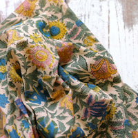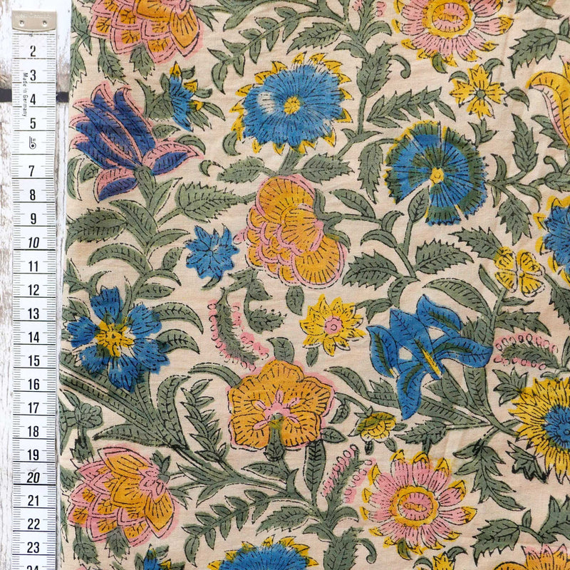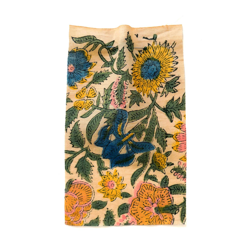 £17.40/mThis is a hand-loomed cotton, hand-printed with a tropical floral design in yellow, green and blue. We love the soft hand-loomed cotton and the imperfections that come from hand printing. This lightweight cotton is suitable for shirts and dresses.