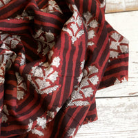 £17.40/mThis is a hand-loomed cotton, printed with a grey and red stripe and a floral motif. The lightweight cotton is soft and semi-sheer, and woven with a striped texture. Suitable for shirts and dresses.