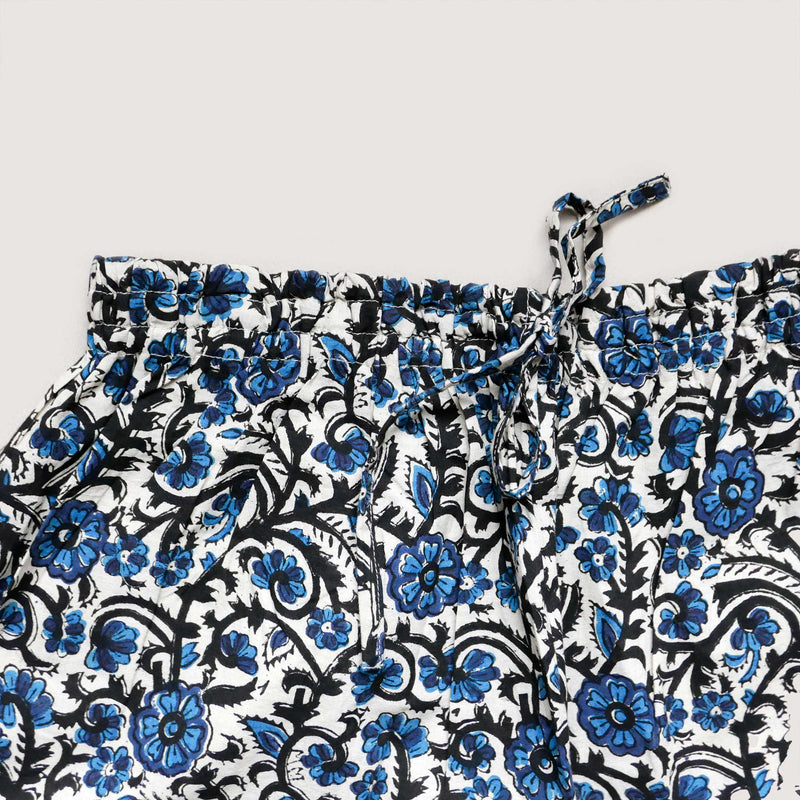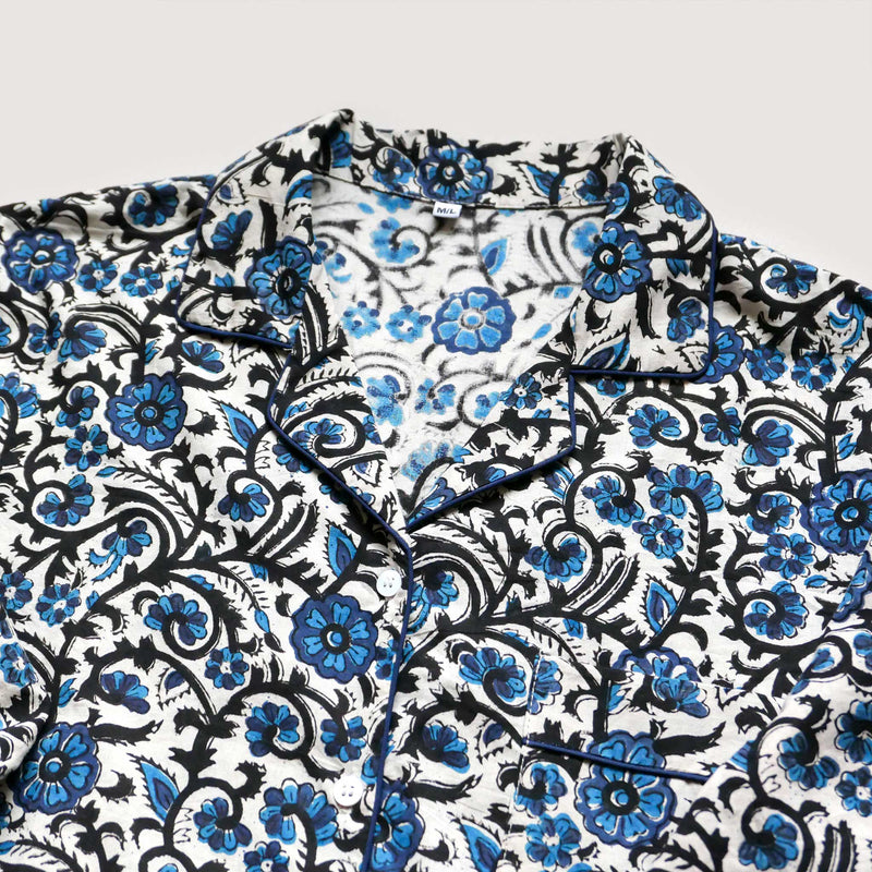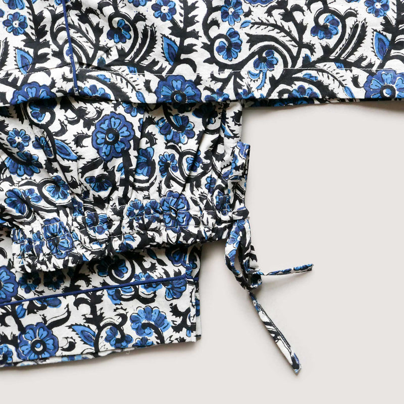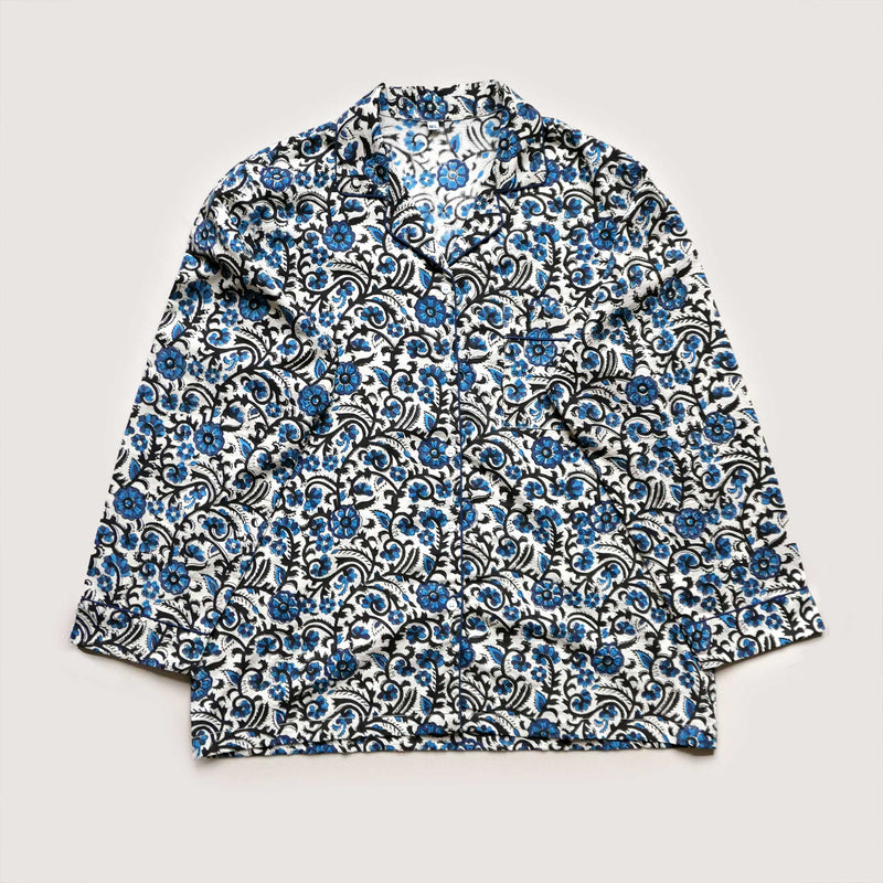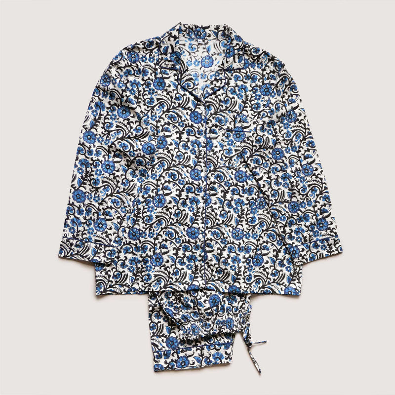 £55.00These cotton pyjamas are made with soft cotton, block-printed with a blue floral print. With a breast pocket and piping detail, the trousers have an elasticated waist and tie. Each pair of pyjamas also come in a printed travel bag.