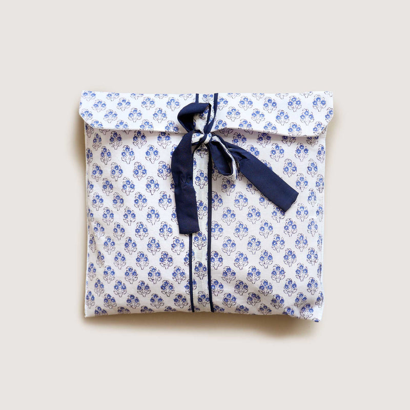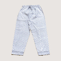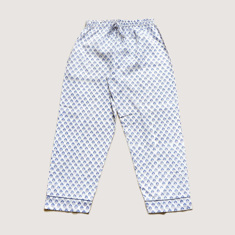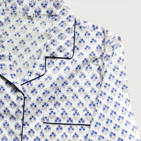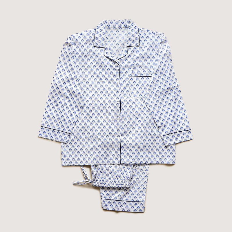 £55.00These cotton pyjamas are made with soft white cotton, block-printed with a blue floral print. With a breast pocket and piping detail, the trousers have an elasticated waist and tie. Each pair of pyjamas also come in a printed travel bag.