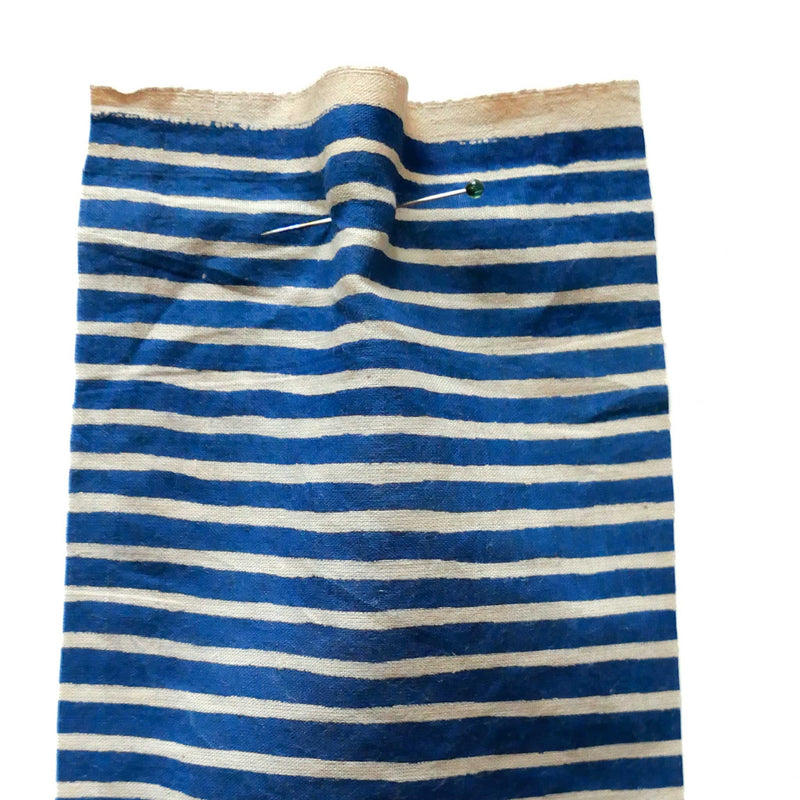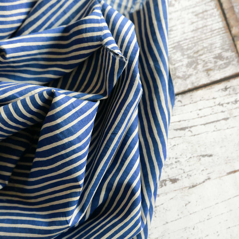 £17.40/mThis is a fine, hand-loomed cotton, hand-printed with a blue stripe on a cream ground. We love the soft hand-loomed cotton and the imperfections that come from hand printing. This lightweight cotton is suitable for shirts and dresses.