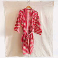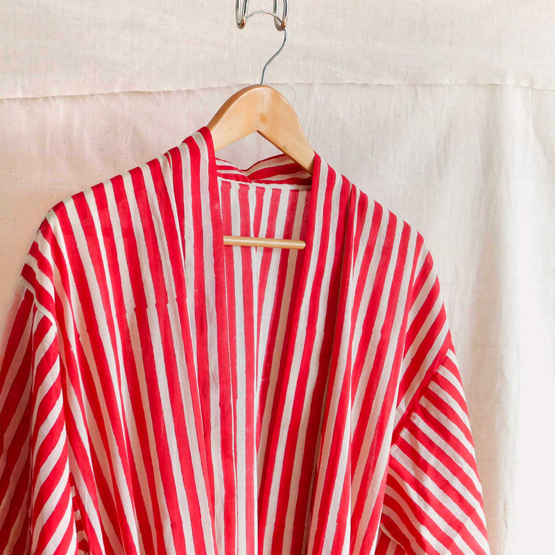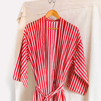 £52.00These cotton robes are made with 100% cotton, hand-printed with a red and beige stripe. The robes have two pockets and a waist tie, with wide cropped sleeves. Each robe comes in a printed travel bag. Soft and lightweight, these are ideal for loungewear, summer dressing gowns and beachwear.