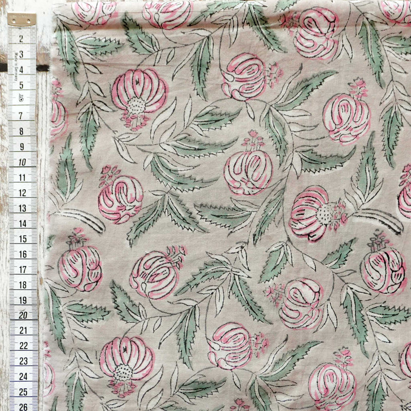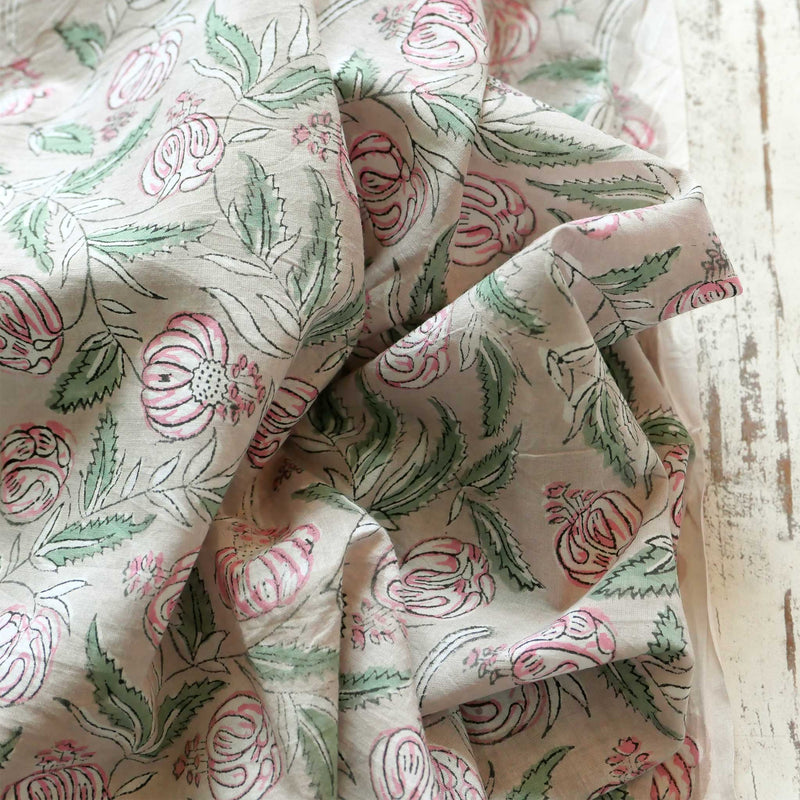 £17.40/mThis is a hand-loomed cotton, hand-printed with a muted floral design in pale grey, pink and green. We love the soft hand-loomed cotton and the imperfections that come from hand printing. This lightweight cotton is suitable for shirts and dresses.