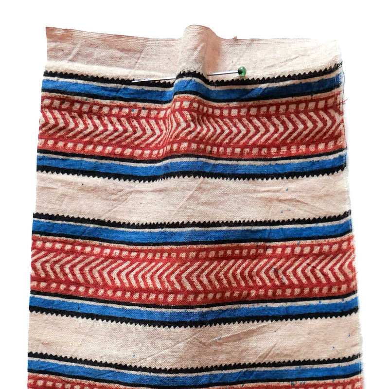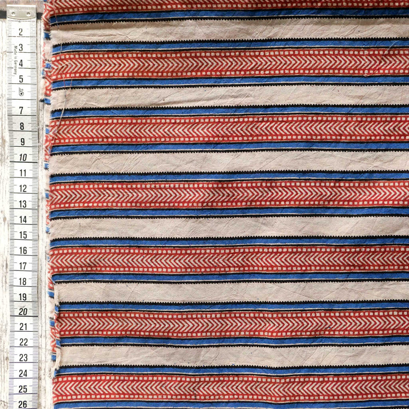 £17.40/mThis is a fine, hand-loomed cotton, hand-printed with a blue and red stripe with chevron details. We love the soft hand-loomed cotton and the imperfections that come from hand printing. This lightweight cotton is suitable for shirts and dresses.