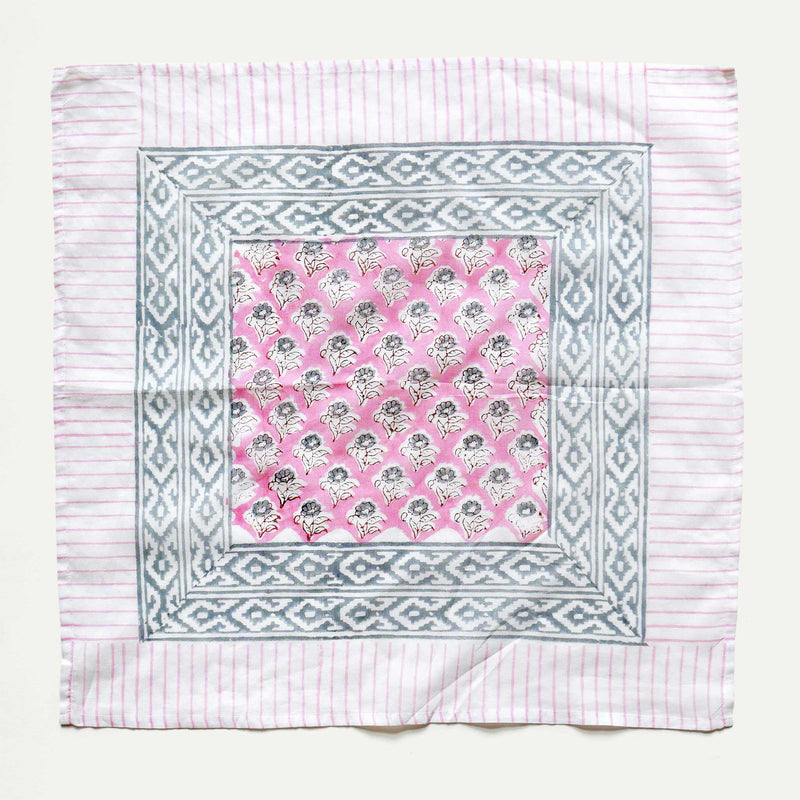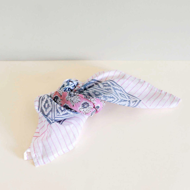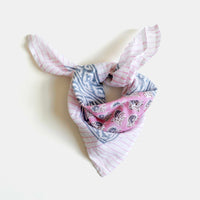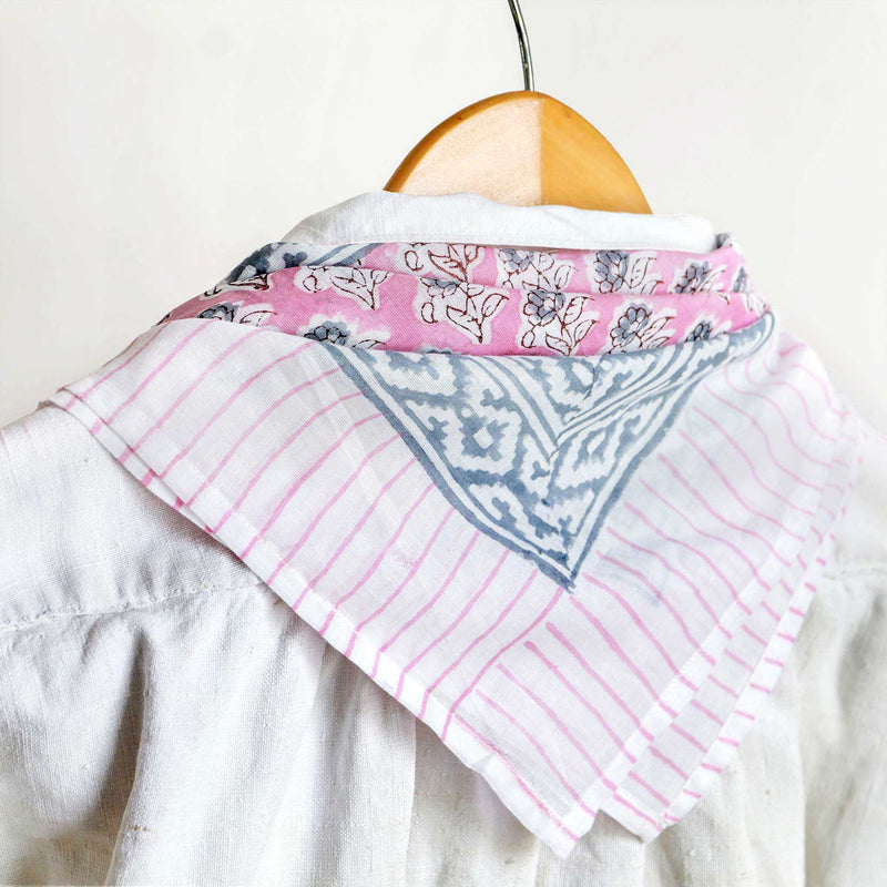 £12.50These cotton bandana scarves are soft and semi sheer, printed with a floral and striped pattern in pink and grey.
