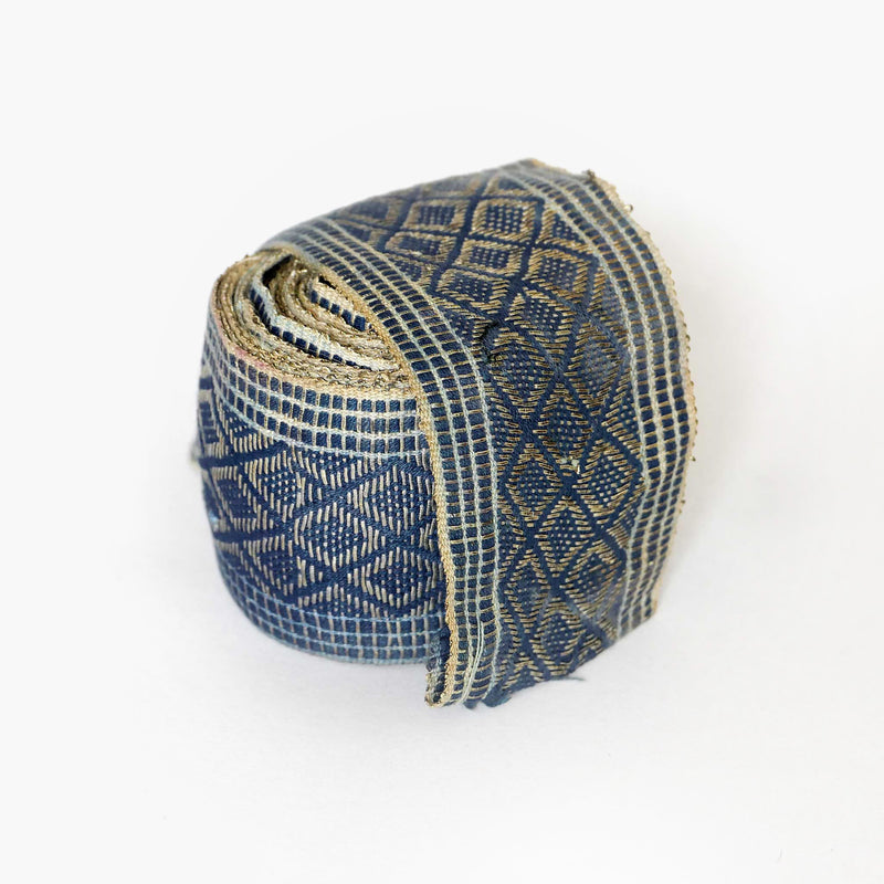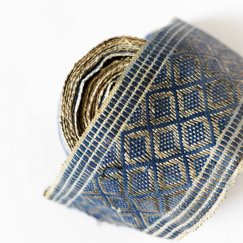 £8.40/mThis is a wide cotton ribbon, woven with metallic thread in a diamond pattern.