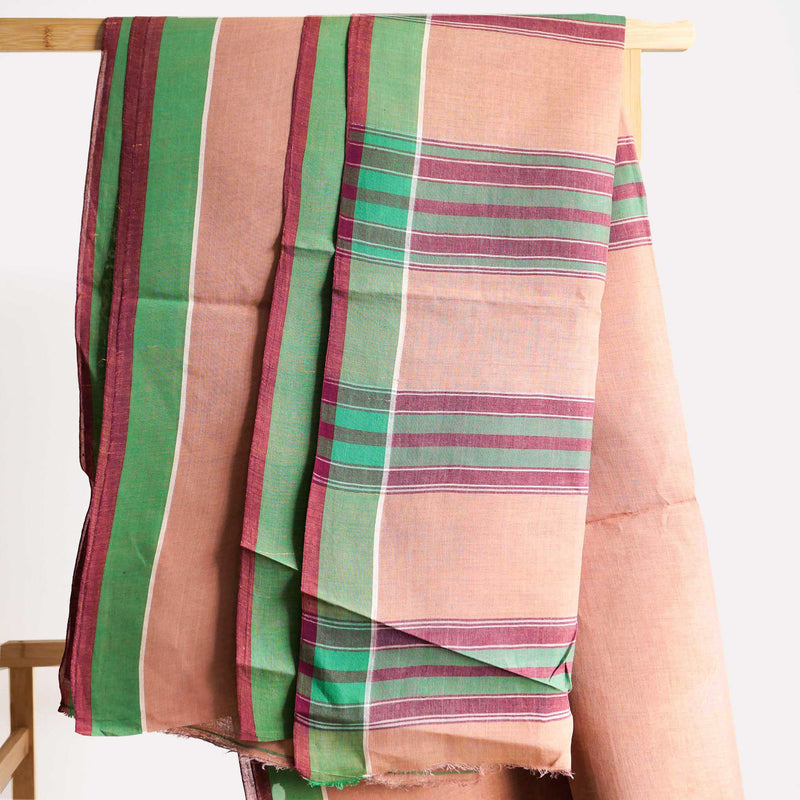 £72.00These hand-loomed cotton saris are woven with colourful stripes at each end, and a colourful border down each selvedge edge. The central 4.5m of the sari is not striped.