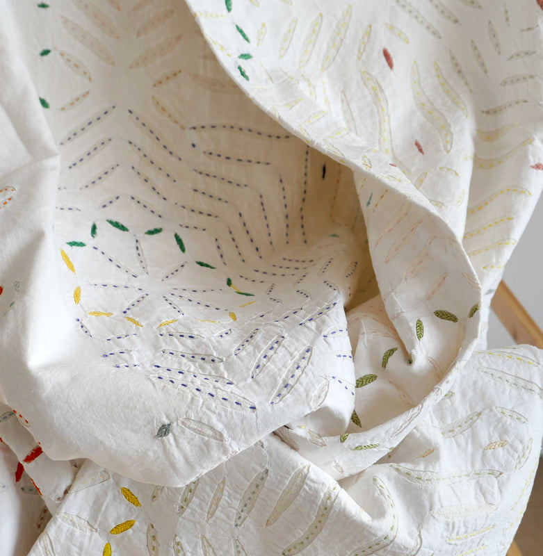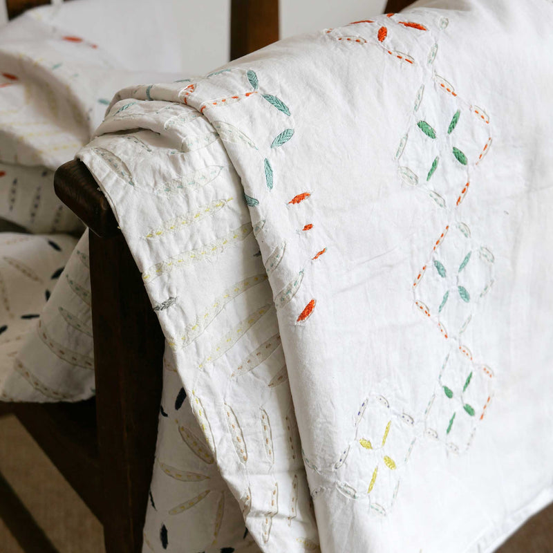 £178.50These applique blankets are incredible. Fine white khadi cotton is hand appliqued onto a cream, calico cotton in an intricate design and embroidered in different colours.