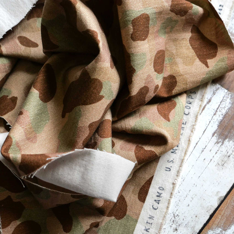 £27.50/mThis cream denim is printed with a reproduction of the US Marine camouflage pattern. Frogskin Camouflage was developed in the 1940s for the U.S military and later became popular for hunting.