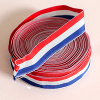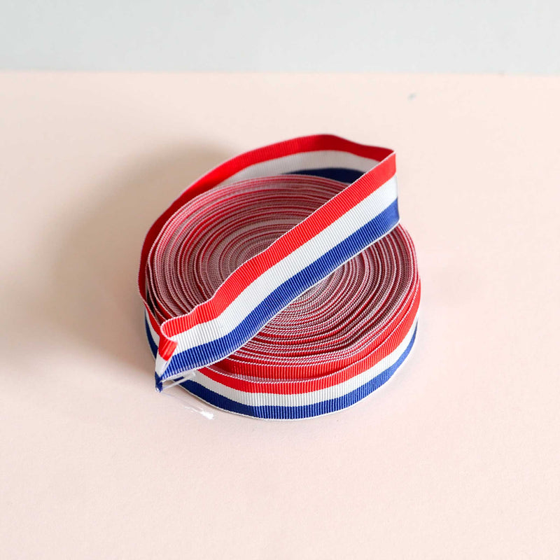 £1.50/mThis stiff grosgrain ribbon has tricolour stripes of red, white and blue.