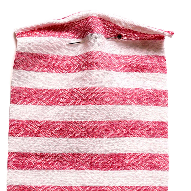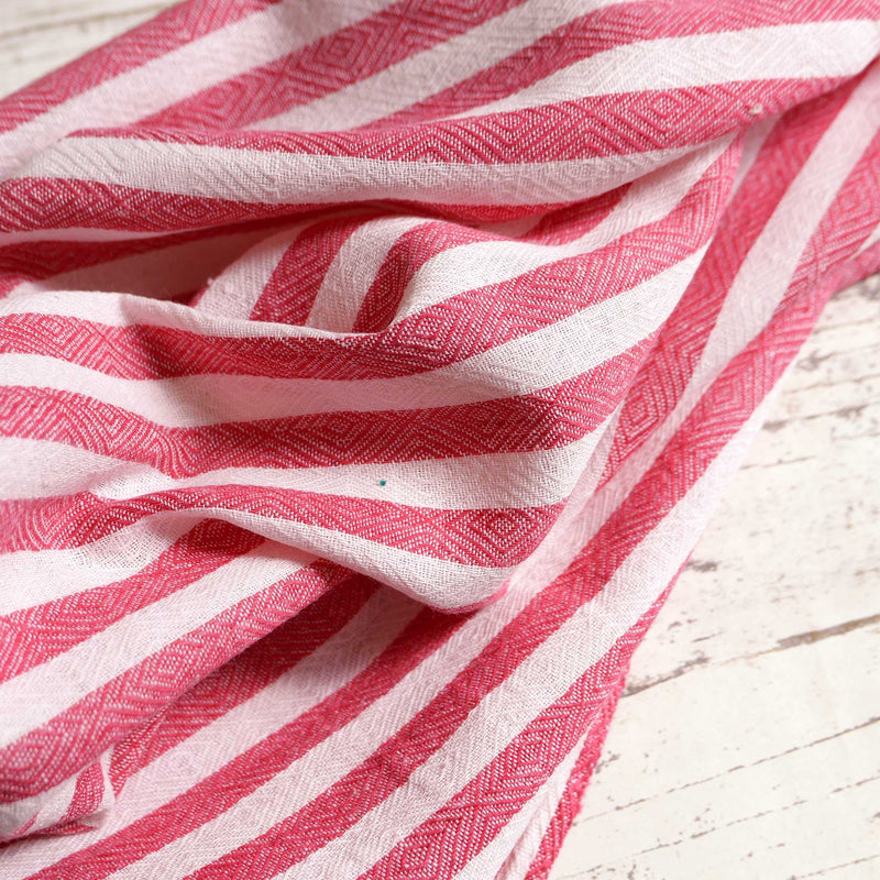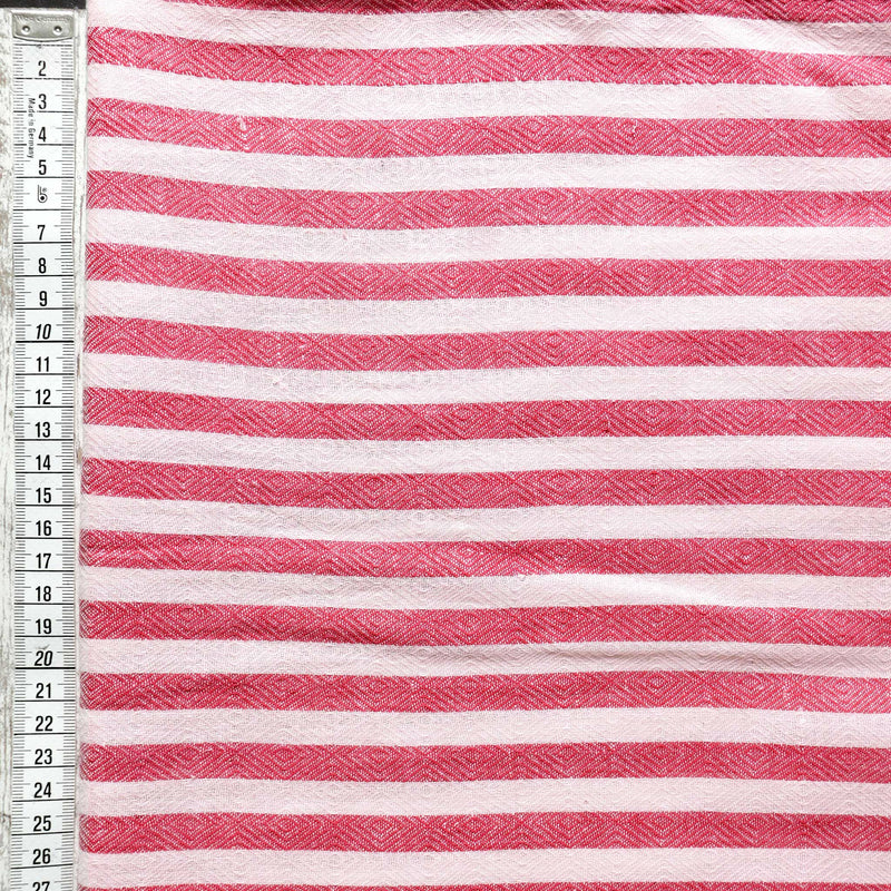 £18.50/mThis cotton handloom is woven with a textured honeycomb pattern and a pink stripe. This is a lightweight and loose-weave cotton.
