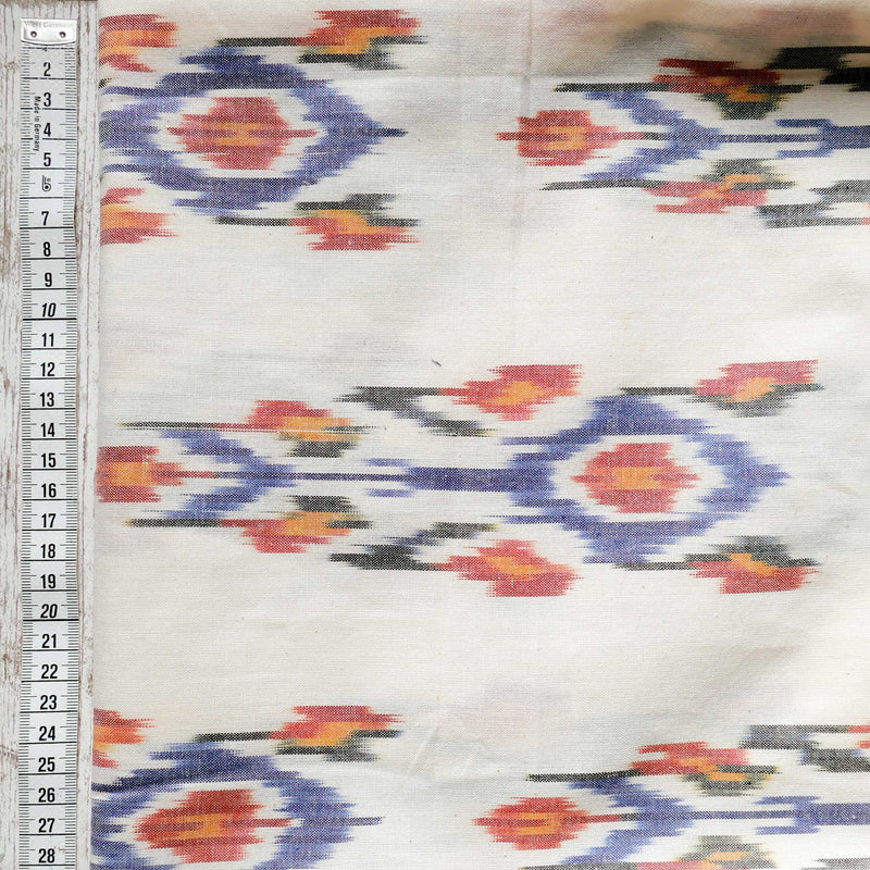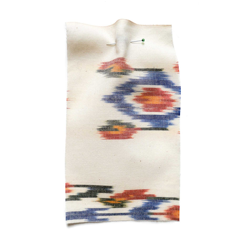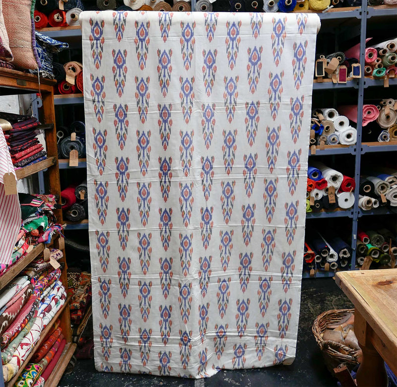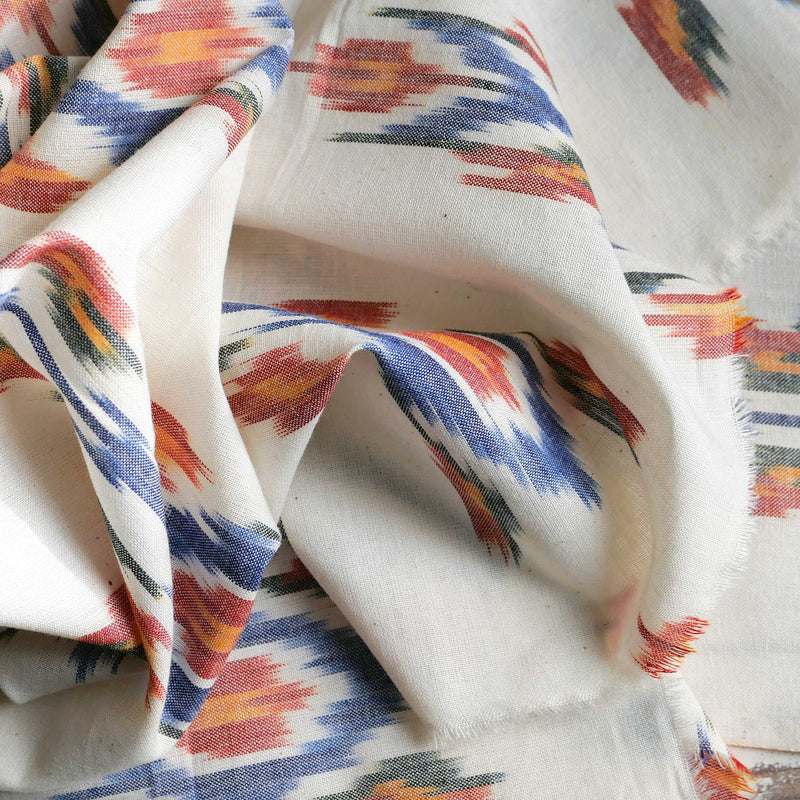 Our Ikats are hand woven in India. The warp and weft threads are tie dyed before weaving to create these indicative patterns. This is a soft and lightweight cotton ikat that would be perfect for shirts and dresses.