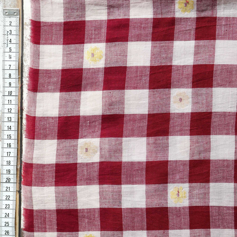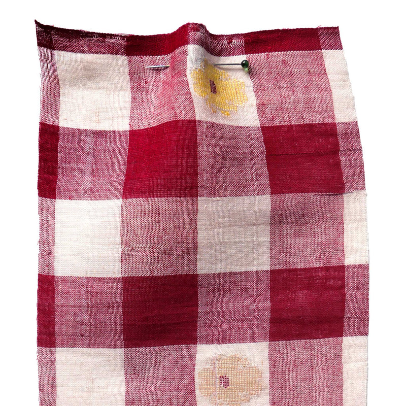This Jamdani is a fine and sheer hand loomed cotton, with an embroidered floral design in 2 colours of yellow, on a large-scale gingham background. We recommend you prewash this fabric before cutting.