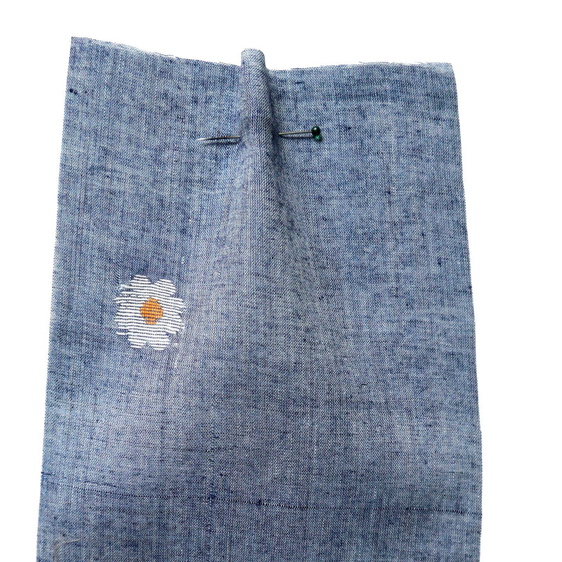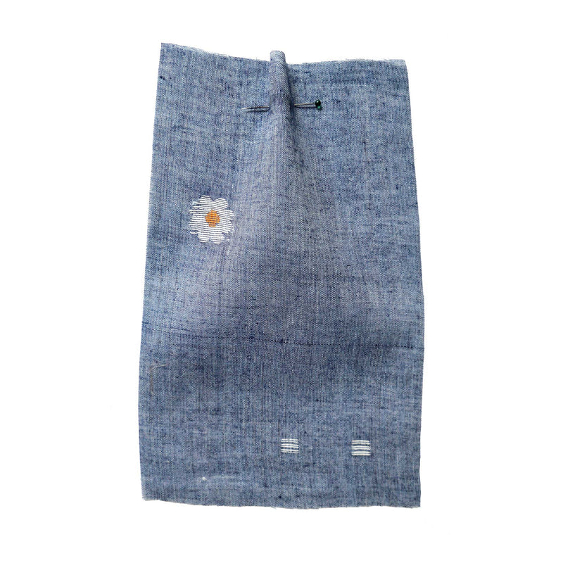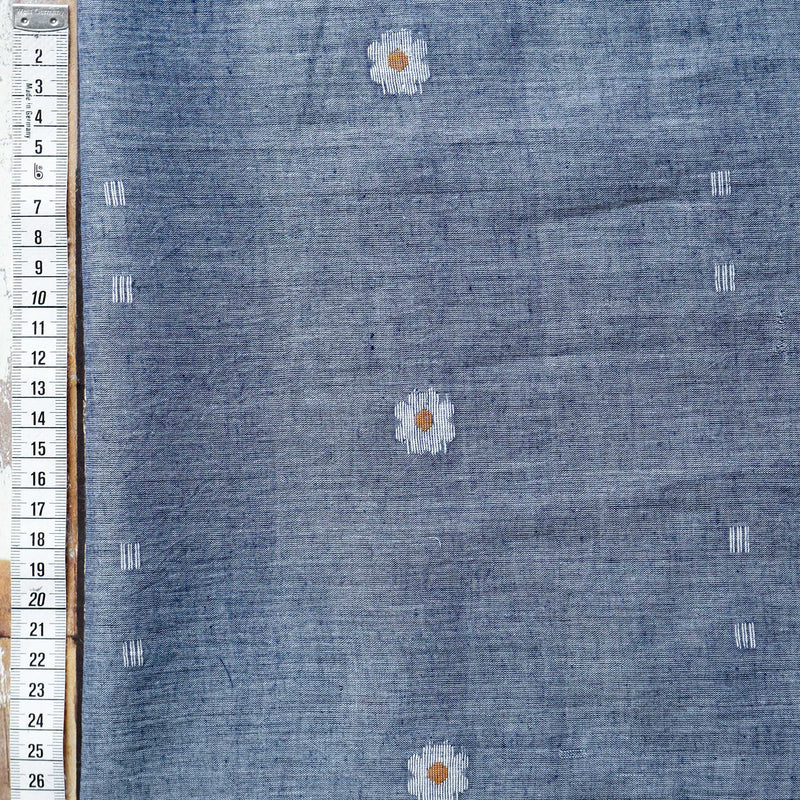 This Jamdani is a fine and sheer hand loomed cotton, with an embroidered daisy design on a soft indigo chambray background. We recommend you prewash this fabric before cutting.