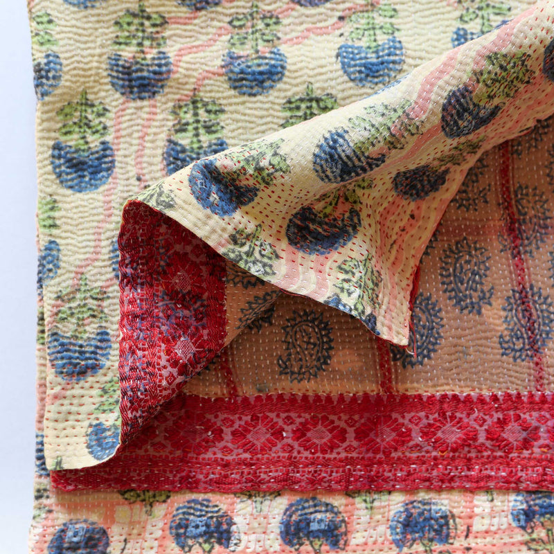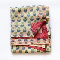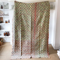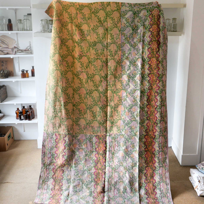 £210.00Traditionally kantha blankets are layers of fabric stitched together using a ‘kantha’ stitch. This quilt is printed with a floral repeat on the front and a leaf design overlayed on the back.