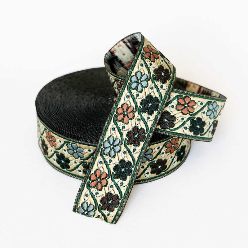£7.60/mThis ribbon is woven with a geometric flower pattern. Woven in a satin stitch with a matte finish.