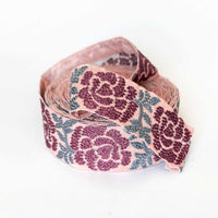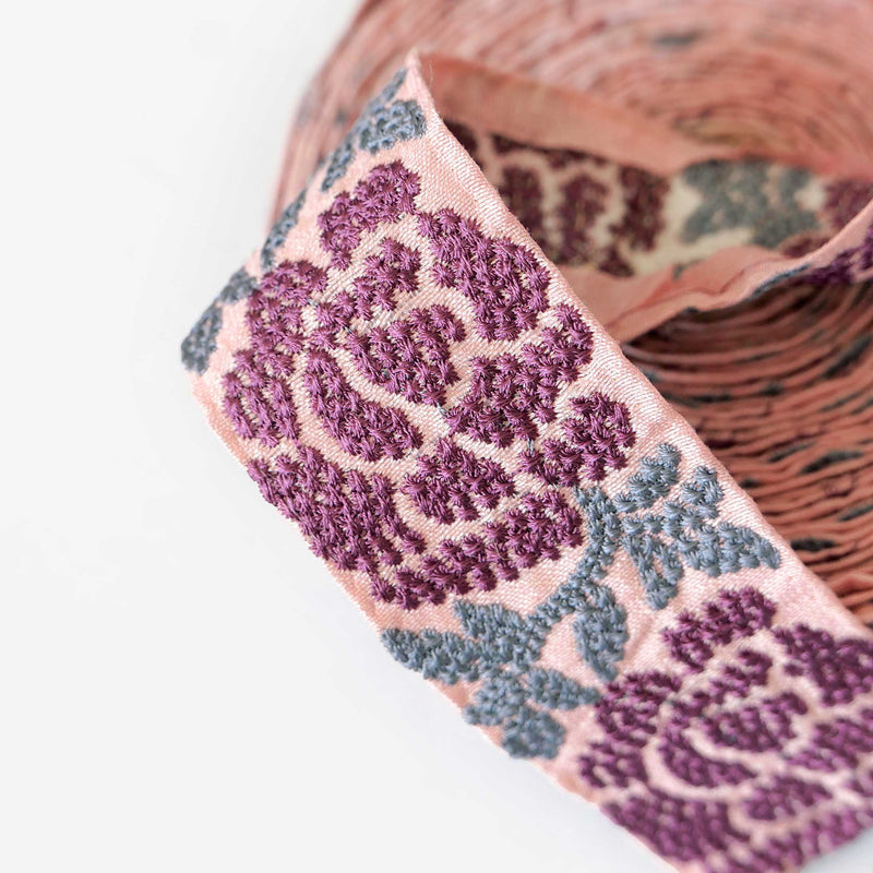 £14.50/mThis is a wide, pale pink trim, decorated with a pink and grey floral embroidery.