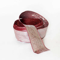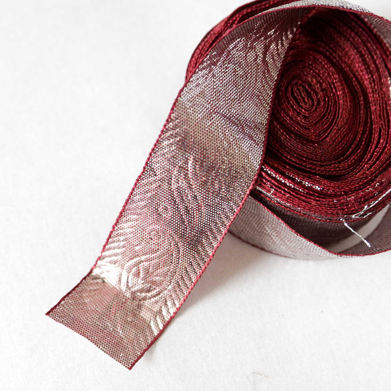 £6.50/mThis is ribbon is woven with silver metallic and dark pink, and embossed with a paisley pattern.