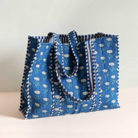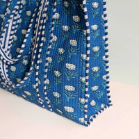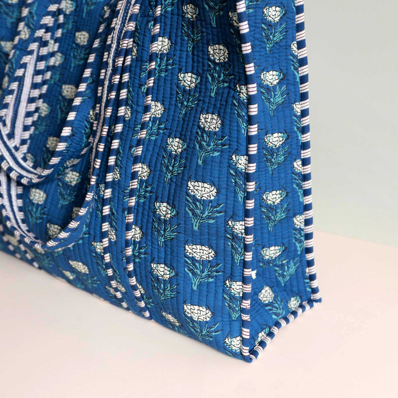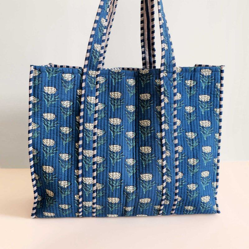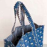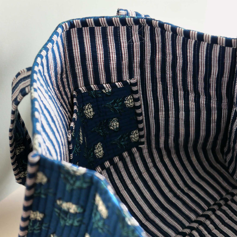 £45.00These tote bags have been made from block-printed cotton in a floral design, lined with a contrasting striped print and finished with a striped cotton binding. This robust design includes a gusset and an internal pocket.