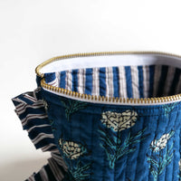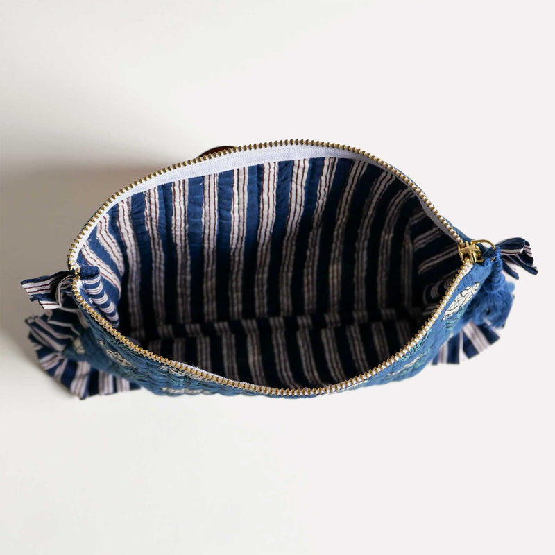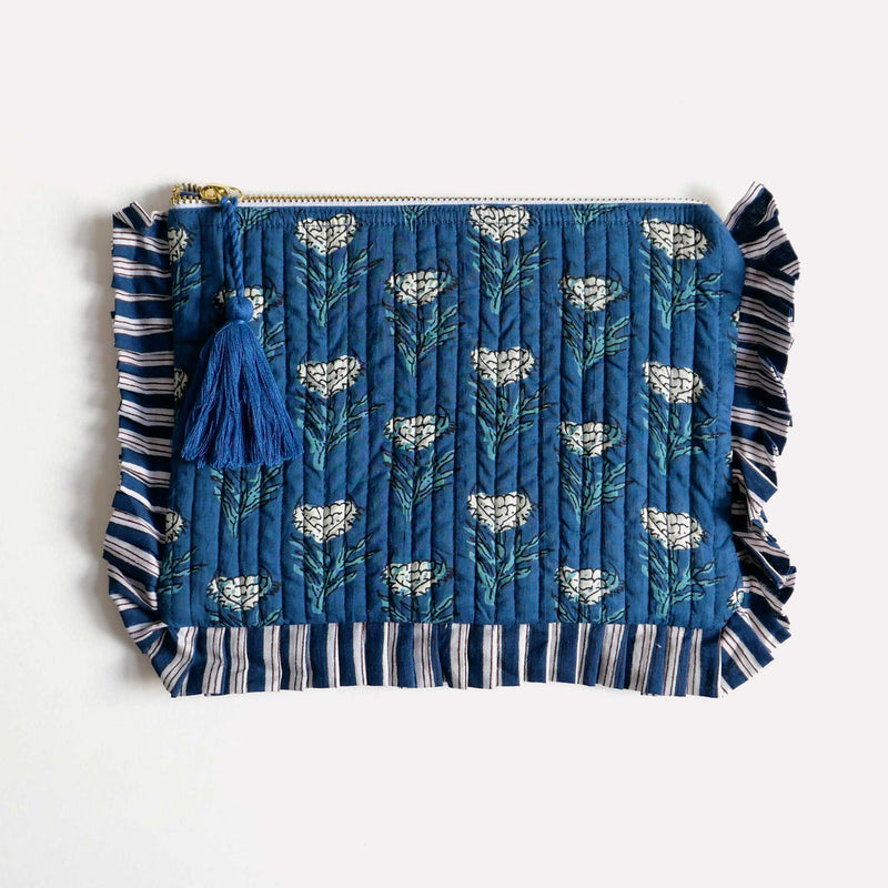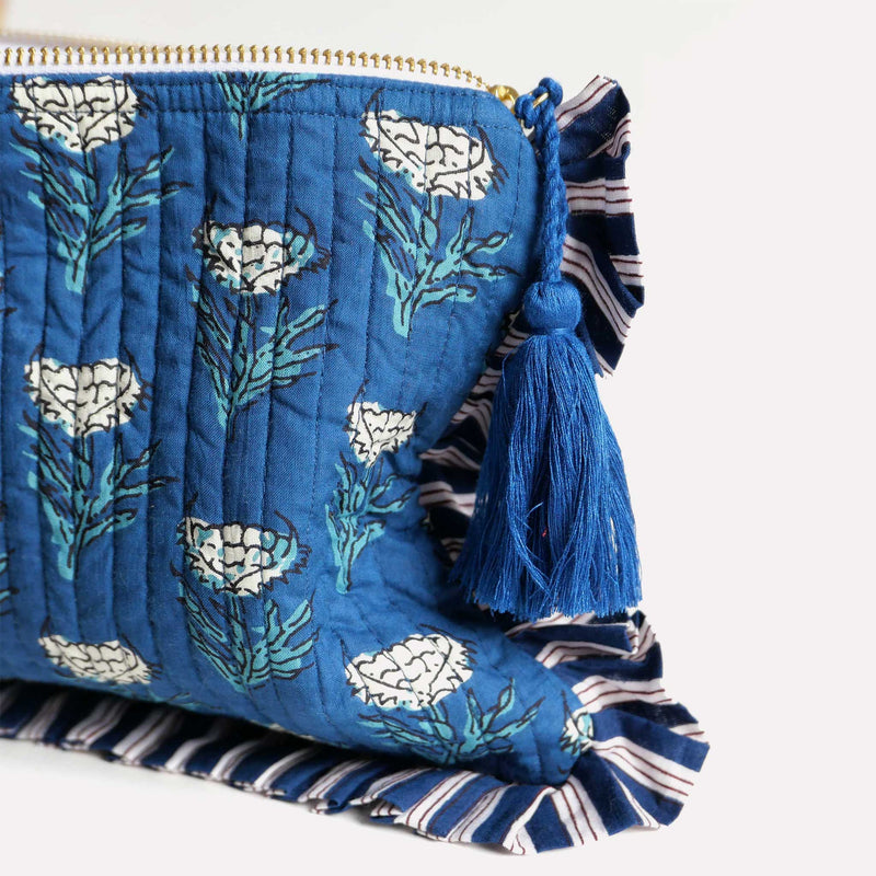 £29.00These wash bags have been made from block-printed cotton in a floral design, lined with a contrasting striped print and finished with a striped cotton ruffle and a tassle. with a zip closure these bags can be used for toiletries, make-up and accessories.