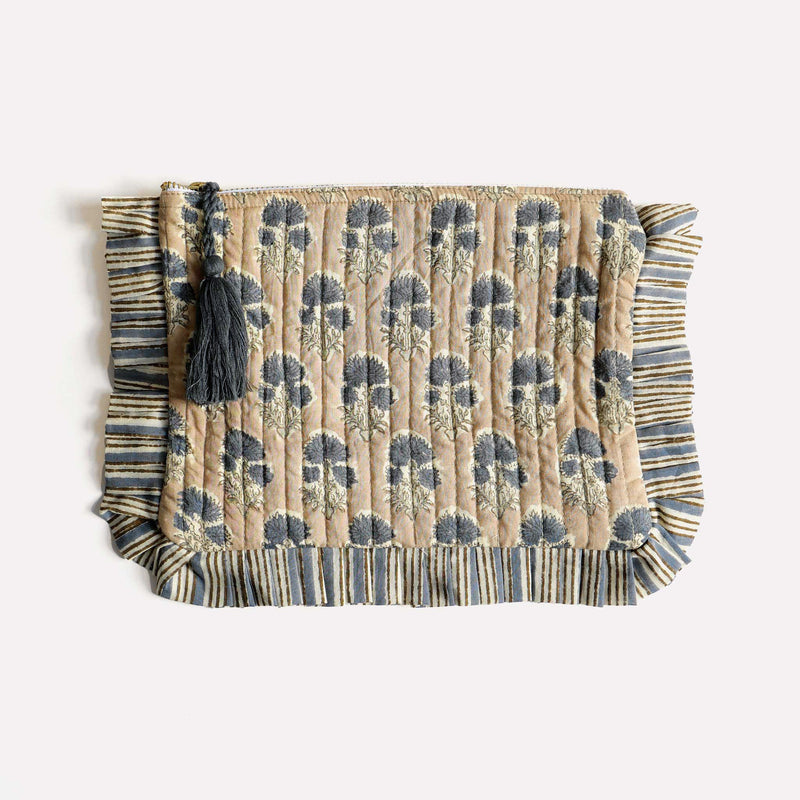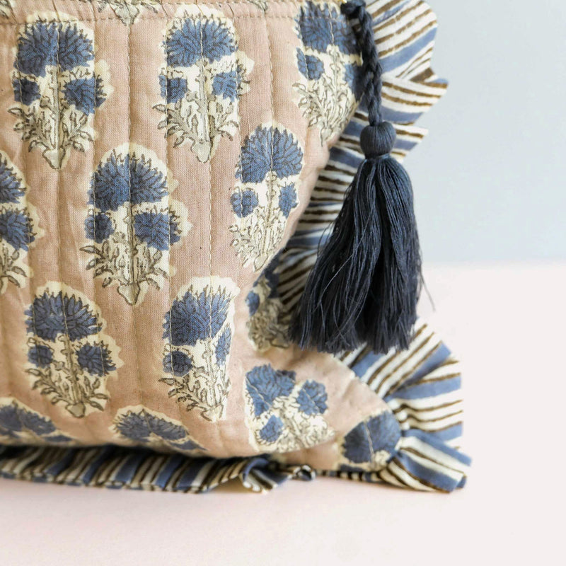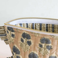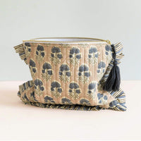 £29.00These wash bags have been made from block-printed cotton in a floral design, lined with a contrasting striped print and finished with a striped cotton ruffle and a tassle. With a zip closure these bags can be used for toiletries, make-up and accessories.