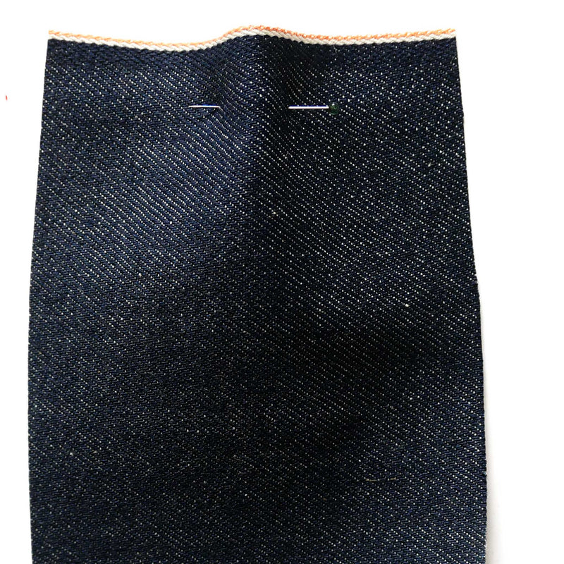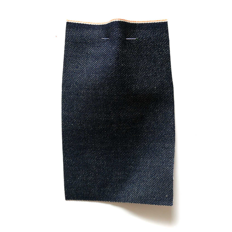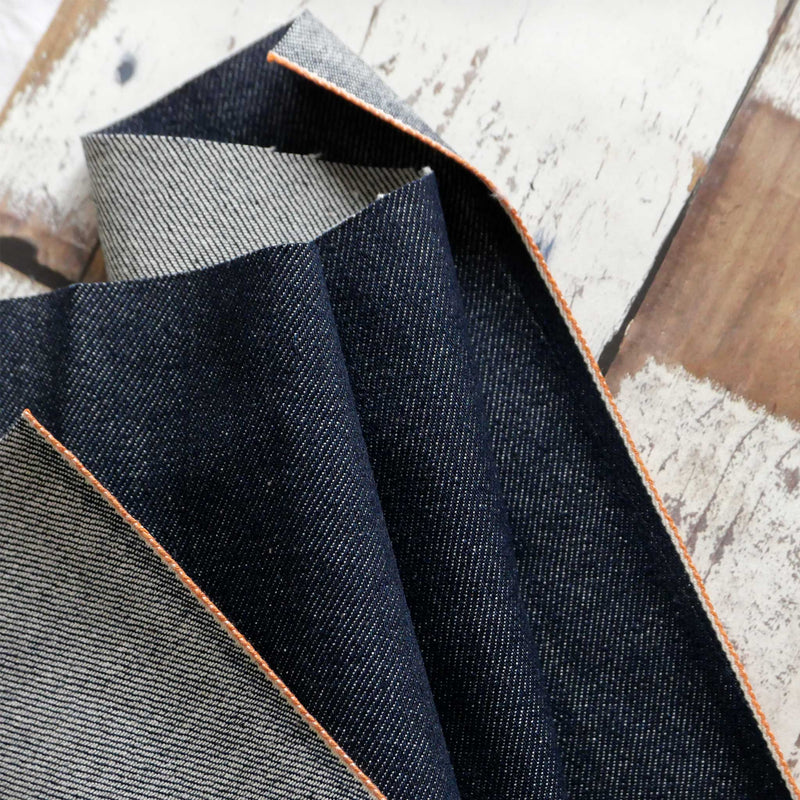 £25.00/mThis is a mid-weight denim in deep indigo blue, with a white and orange stitched selvedge.