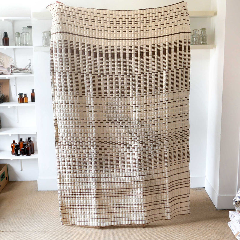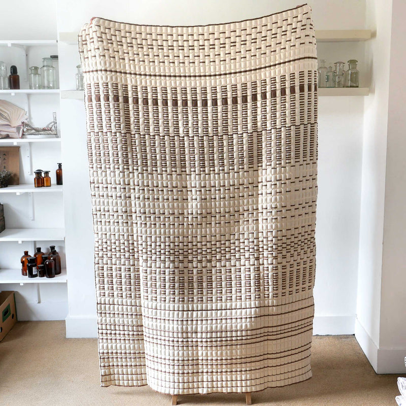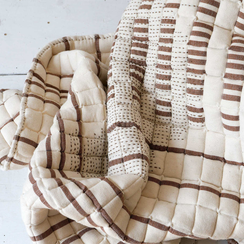 This quilt has a cream and brown striped design with a running stitch embroidery on one side.