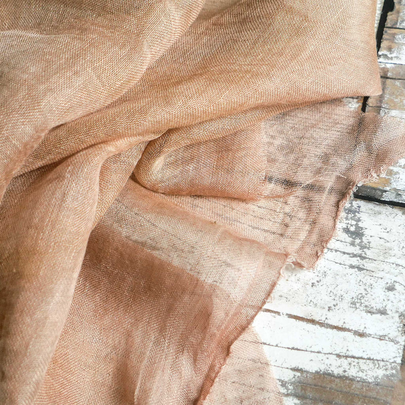 £40.00/mThis is a lightweight Japanese linen muslin, a gauze like fabric which is soft and incredibly sheer. The fabric is dyed with natural tannins from onion skins. Onion skins are left to soak to create a warm hue that flashes from golden yellow to peach and pink. Due to the nature of the dye, the colour is mottled and marbled, and inconsistencies are to be expected.