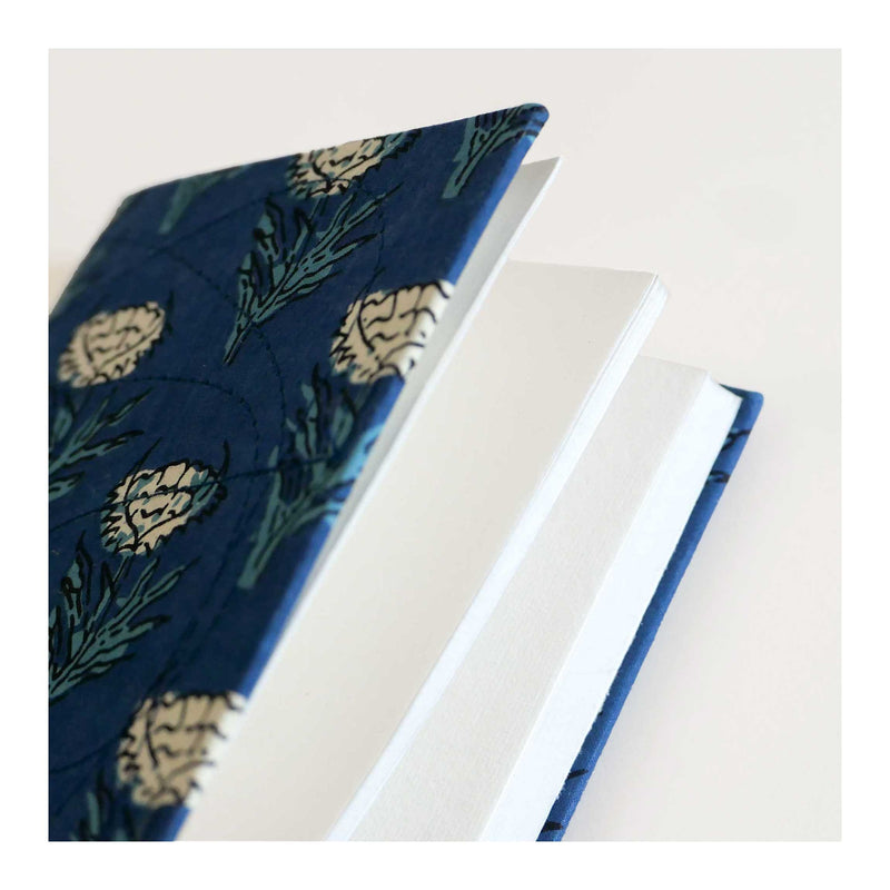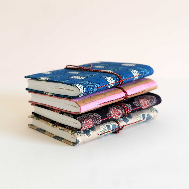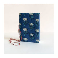 £14.20This is a plain paper notebook, bound and covered with block printed cotton. A multi coloured string is used as a tie closure.