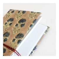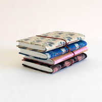 £14.20This is a plain paper notebook, bound and covered with block printed cotton. A multi coloured string is used as a tie closure.