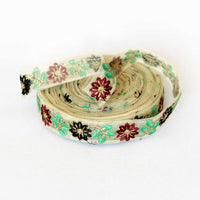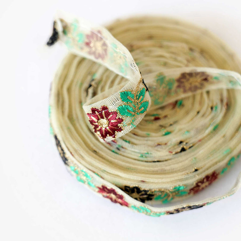 £9.50/mThis is a beige coloured tulle trim, decorated with multicoloured floral embroidery.