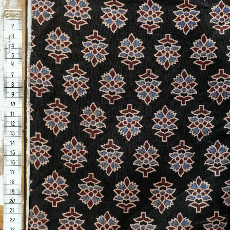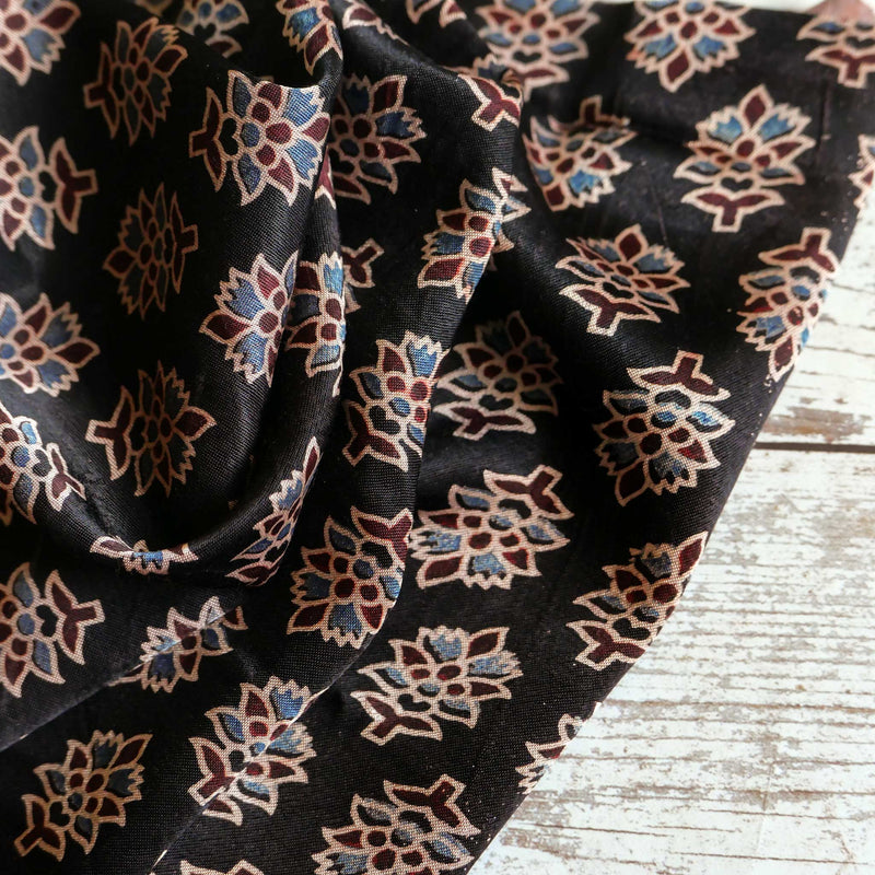 £24.30/mViscose sateen is a beautifully drapey, dress-weight fabric, dyed in jewel like colours an block printed with a floral print in black, red and blue.