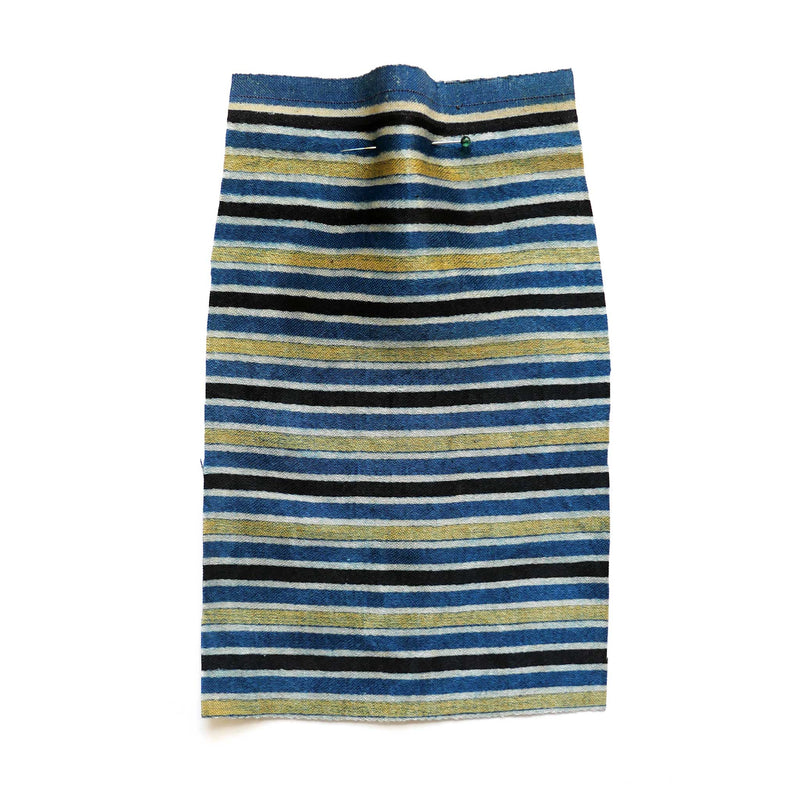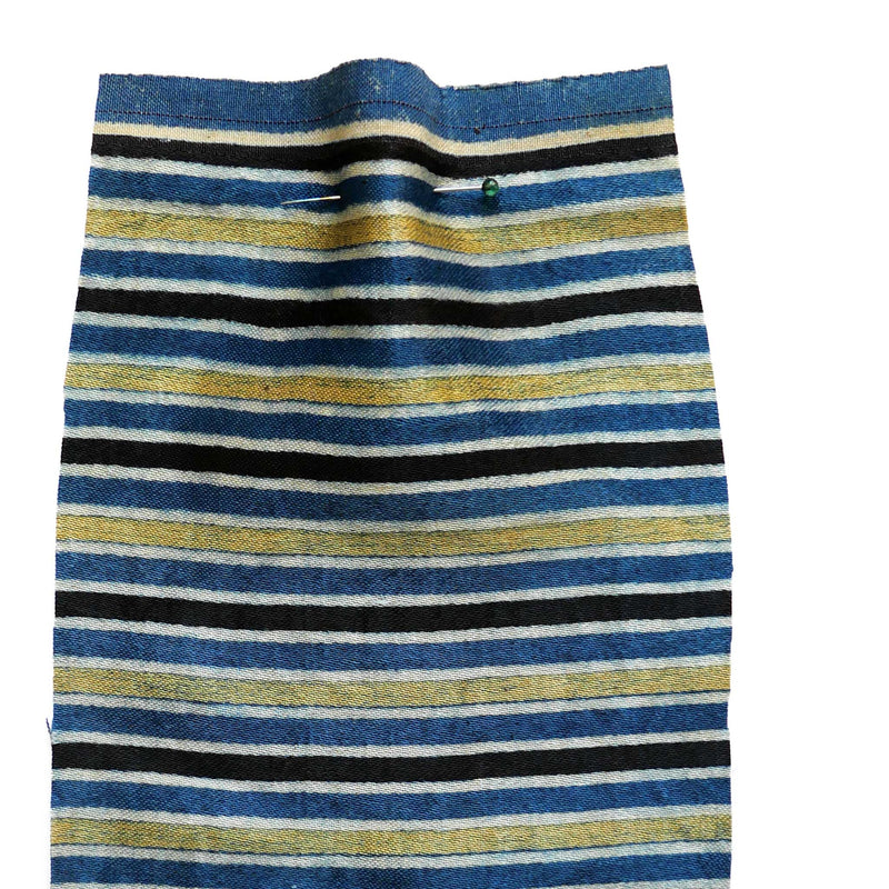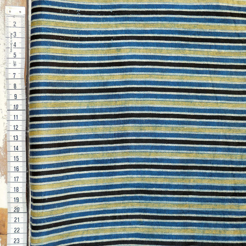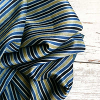 £24.30/mViscose sateen is a beautifully drapey, dress-weight fabric, printed with a cream, yellow and black stripe on Indigo blue.