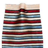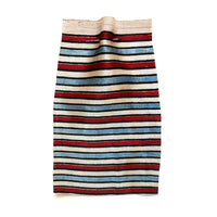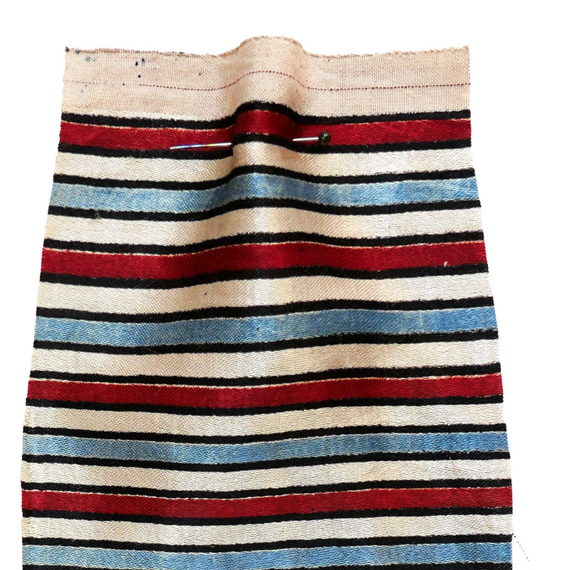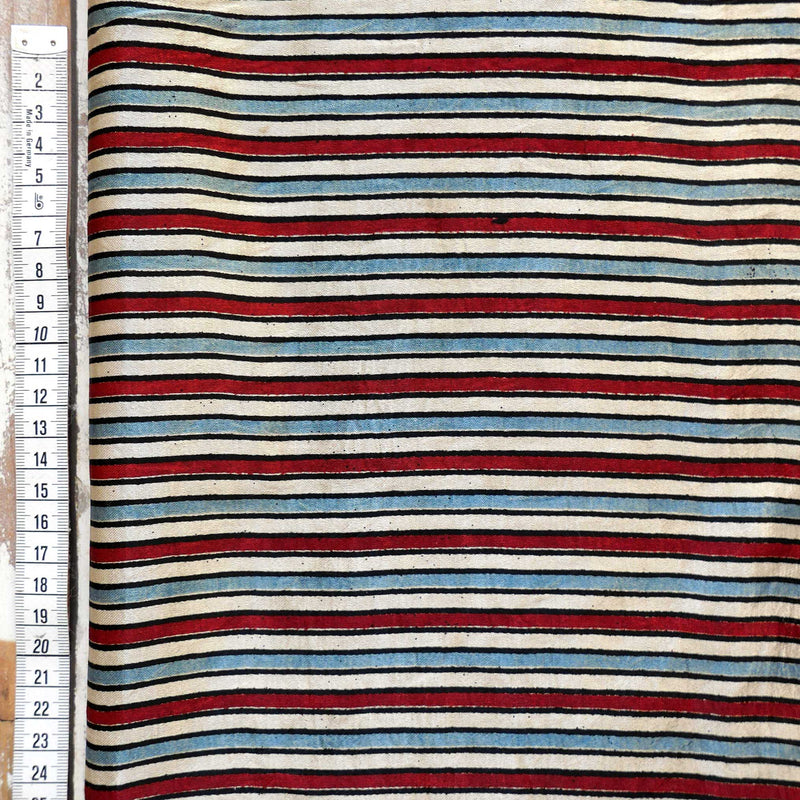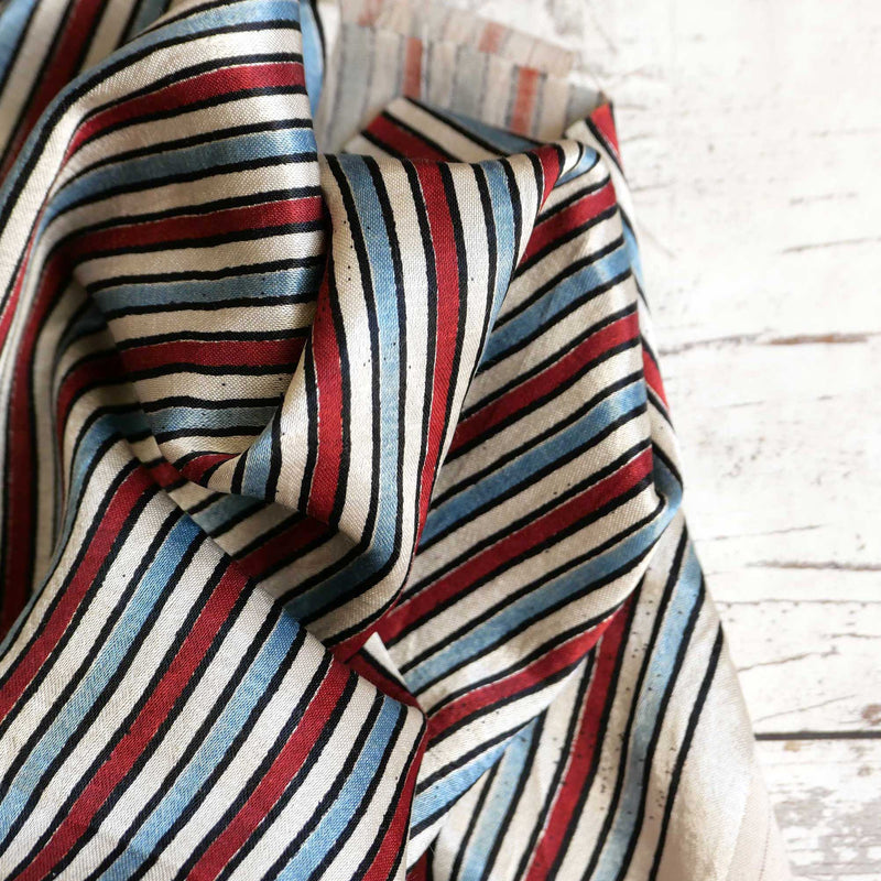 £24.30/mViscose sateen is a beautifully drapey, dress-weight fabric, printed with a cream, red and blue stripe on iron blue.